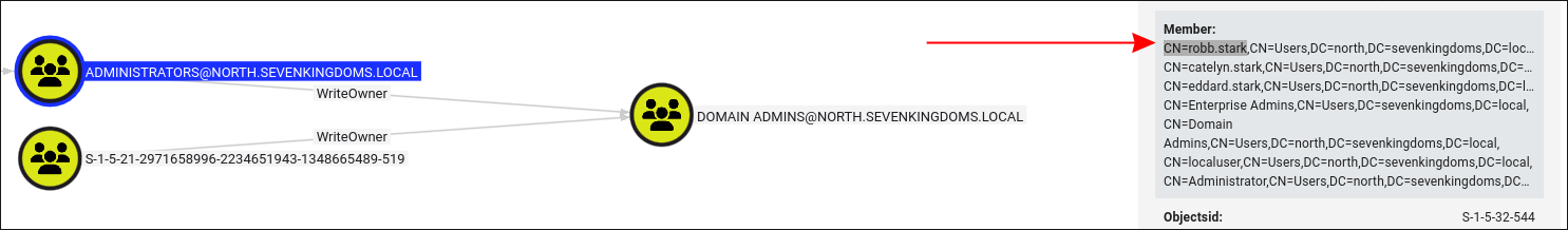 member: CN=robb.stark,CN=Users,DC=north,DC=sevenkingdoms,DC=local, CN=catelyn.stark,CN=Users,DC=north,DC=sevenkingdoms,DC=local, CN=eddard.stark,CN=Users,DC=north,DC=sevenkingdoms,DC=local, CN=Enterprise Admins,CN=Users,DC=sevenkingdoms,DC=local, CN=Domain Admins,CN=Users,DC=north,DC=sevenkingdoms,DC=local, CN=localuser,CN=Users,DC=north,DC=sevenkingdoms,DC=local, CN=Administrator,CN=Users,DC=north,DC=sevenkingdoms,DC=local